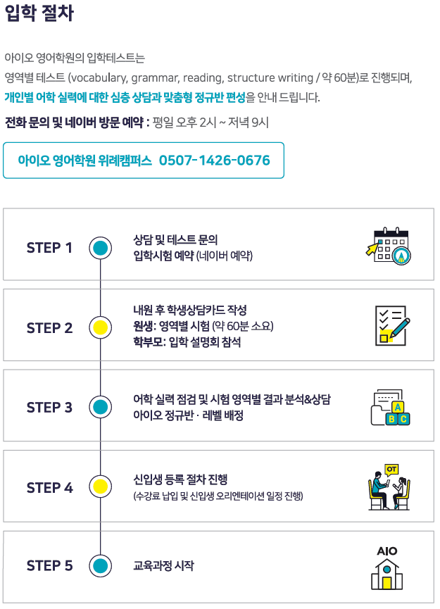 - 입학 테스트 가능 요일: 매주 화요일 / 목요일 3시 30분 또는 6시 30분 예약 가능