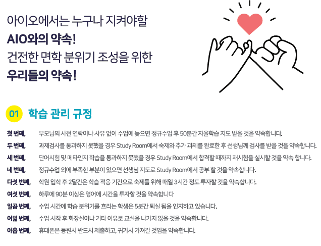- 정규수업 외에 부족한 부분이 있으면 선생님 지도로 Study Room에 남아서 공부 할 것을 약속합니다.